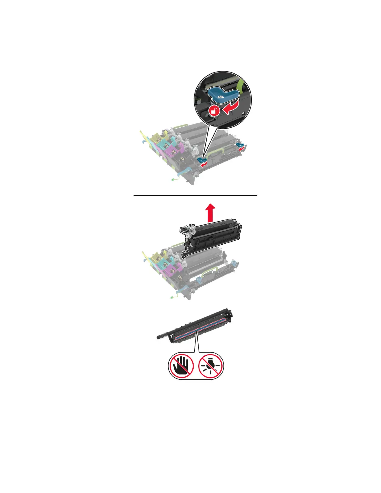 Warning—Potential Damage: Do not touch the shiny photoconductor drum under the imaging unit.