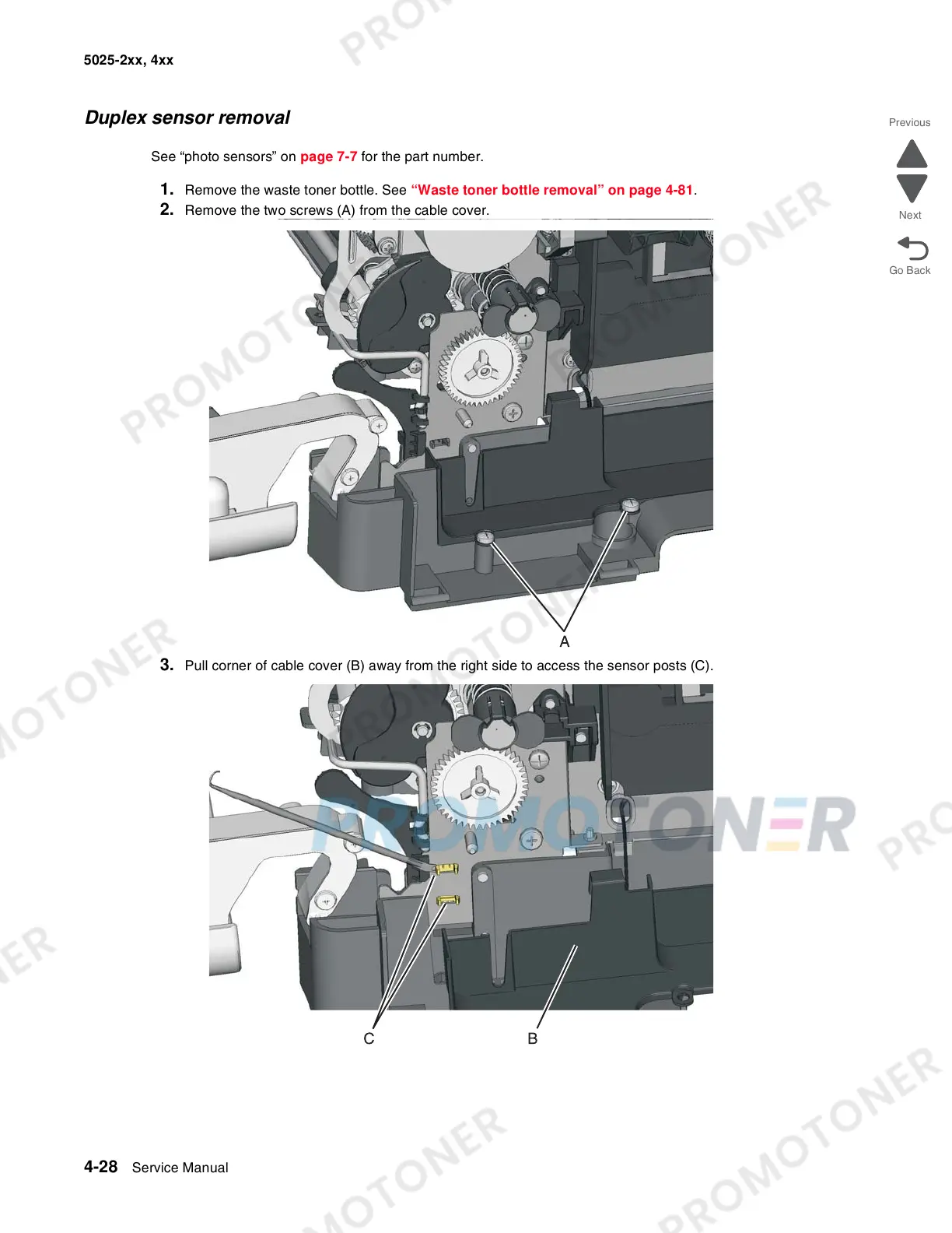1. Remove the waste toner bottle. See Waste toner bottle removal” on page 4-81.