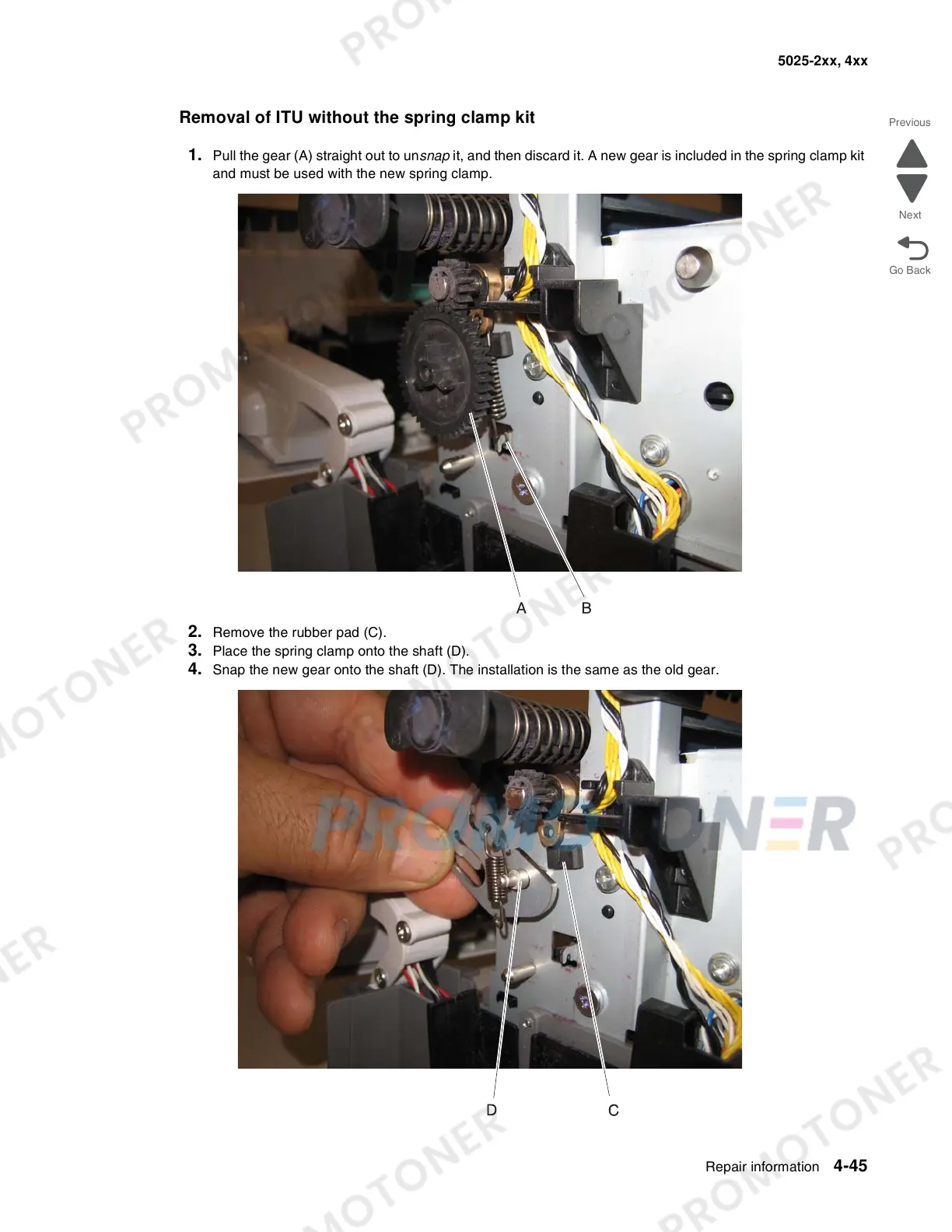 4. Snap the new gear onto the shaft (D). The installation is the same as the old gear.