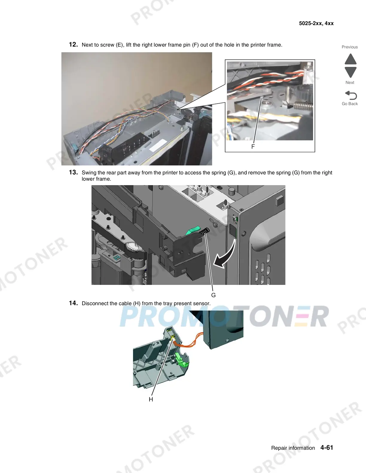 12. Next to screw (E), lift the right lower frame pin (F) out of the hole in the printer frame.
