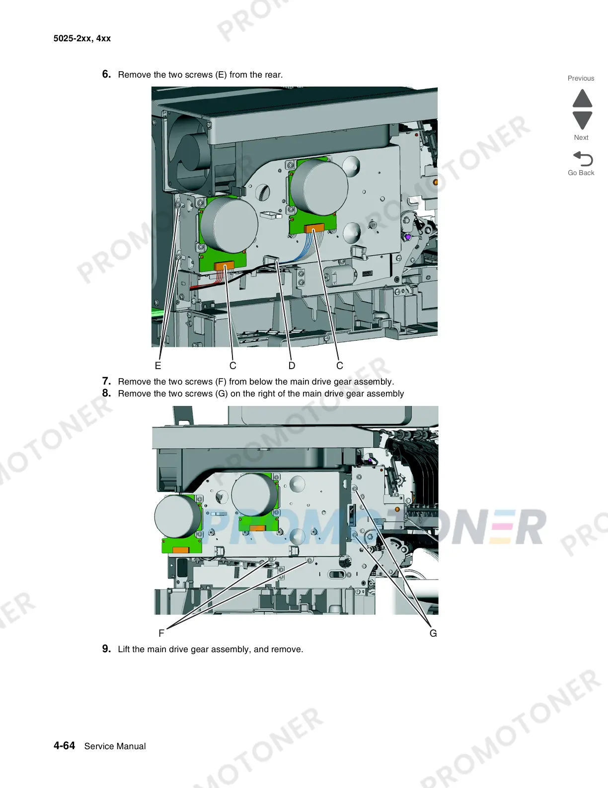 7. Remove the two screws (F) from below the main drive gear assembly.