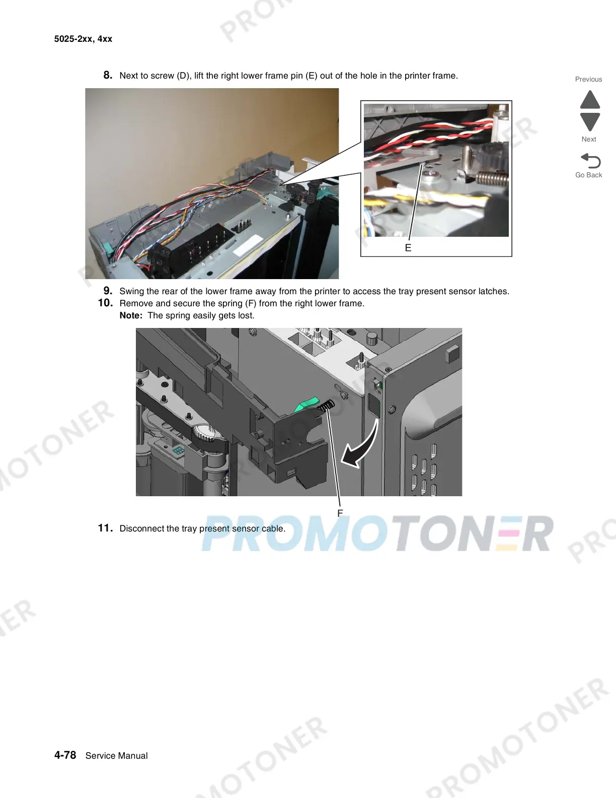 9. Swing the rear of the lower frame away from the printer to access the tray present sensor latches.