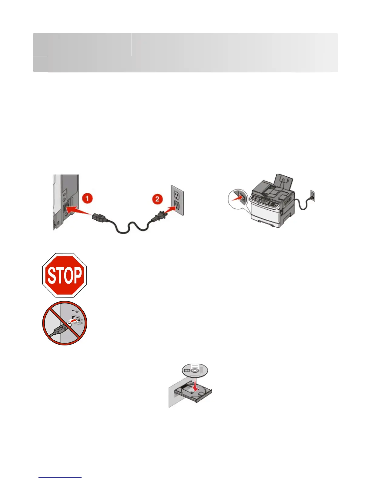 1 Connect the power cable to the printer and then to a properly grounded electrical outlet, and then turn the printer