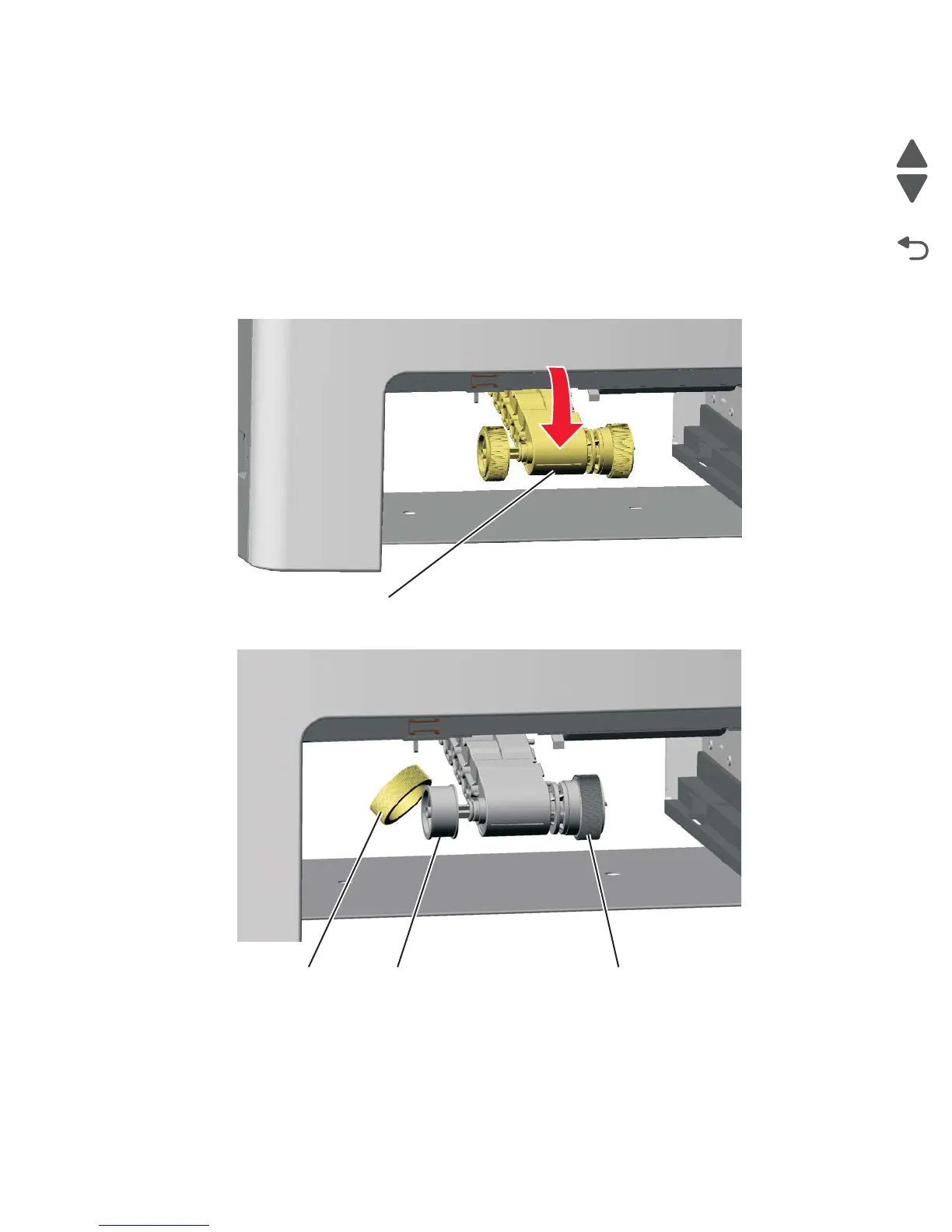 3. Remove the pick arm roll (B) from the pick arm roll assembly (C). Repeat for the other pick arm roll (D).