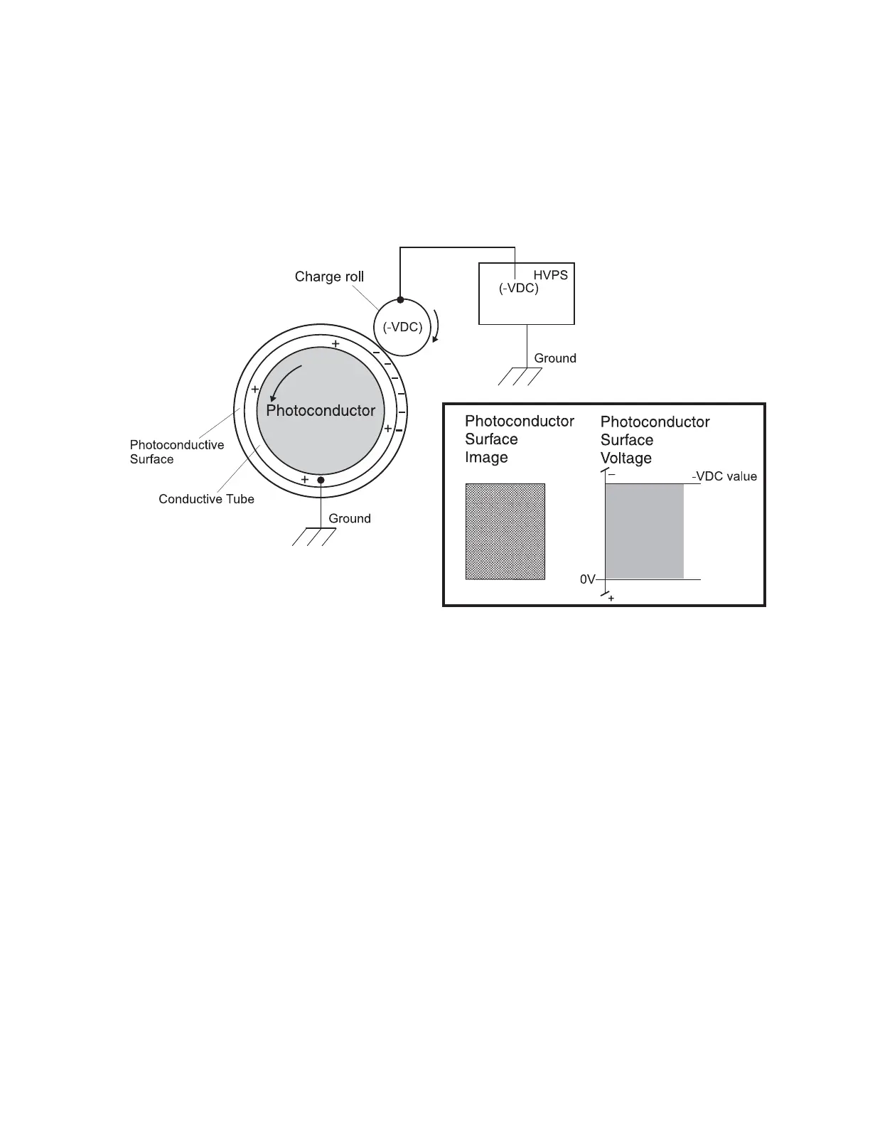 The charge roller puts a uniform negative charge over the entire surface of the photoconductor to prepare it for