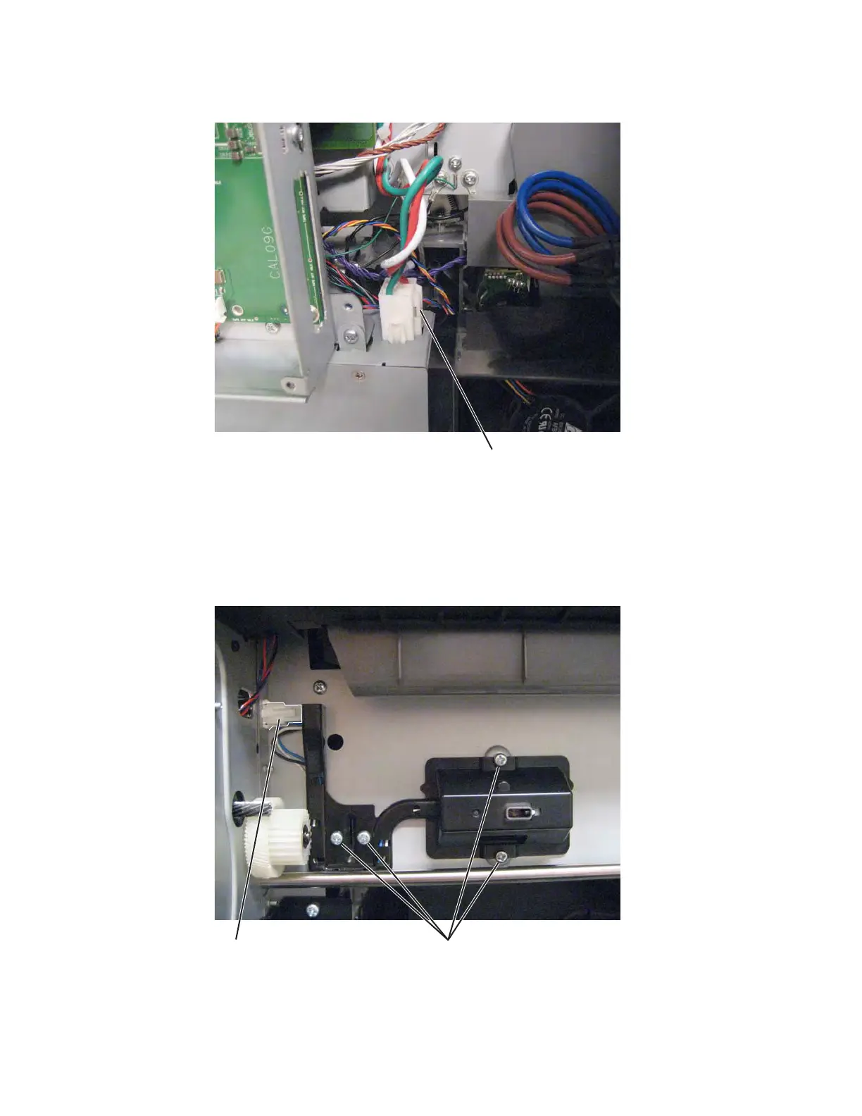 11. Push in the tab (E) to disconnect the cable from the LVPS, and remove the cable.