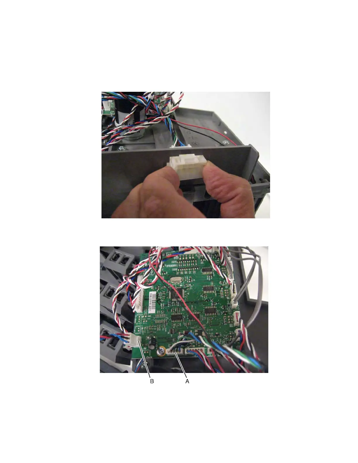 4. Disconnect the cable (A) from the controller card, and press the latch to disconnect cable (B) from the