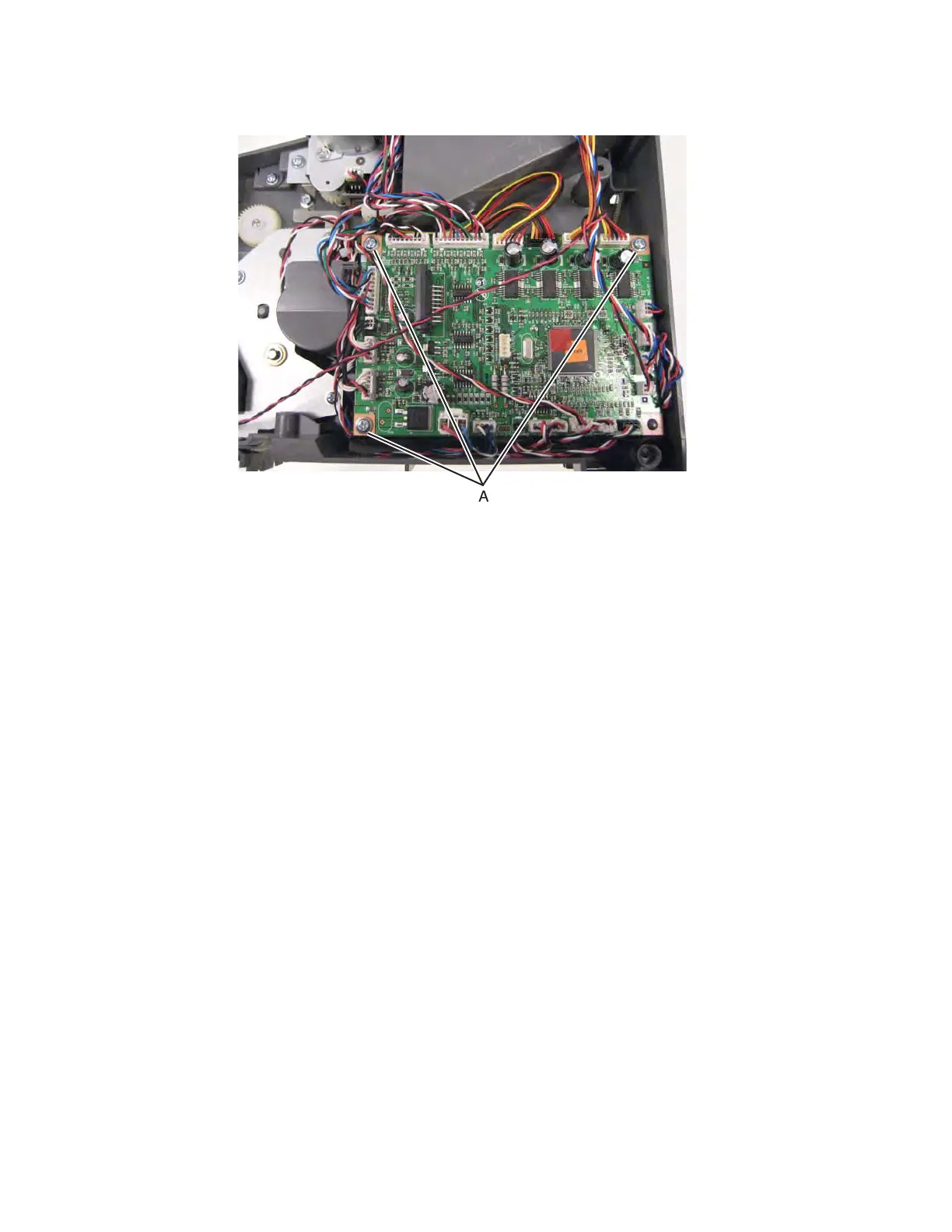 4. Remove the three screws (A) securing the stapler/stacker controller card assembly.