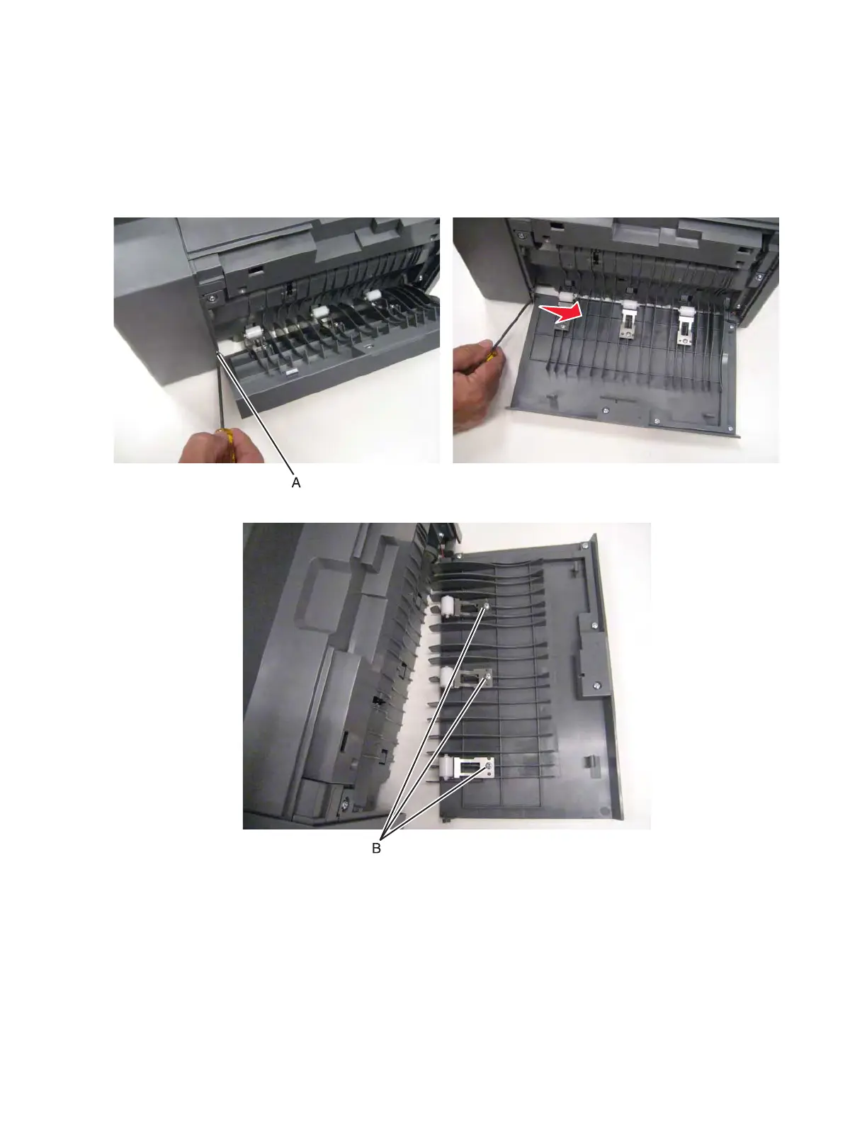 3. Using a screwdriver, force the rear hinge (A) out of the slot by pushing the door to the front.