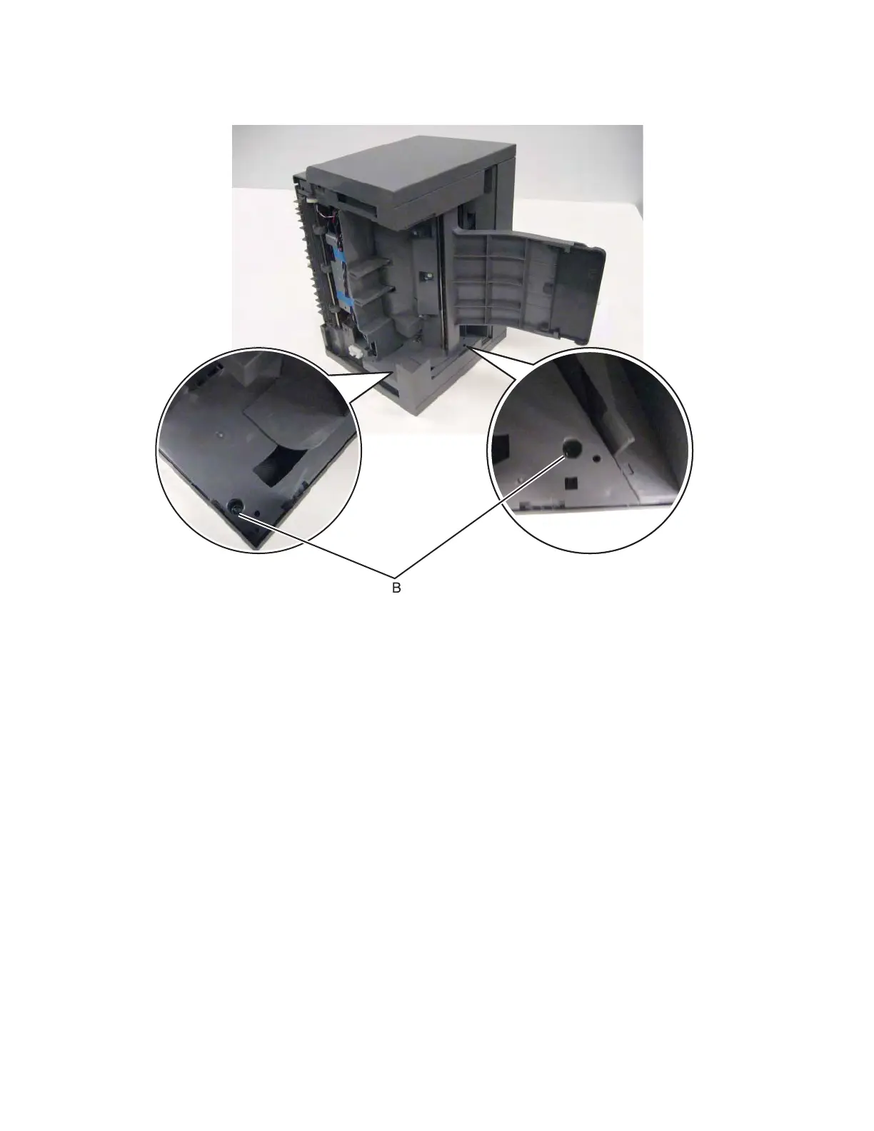 4. Remove the two screws (B) on the inside of the exit bin compartment.