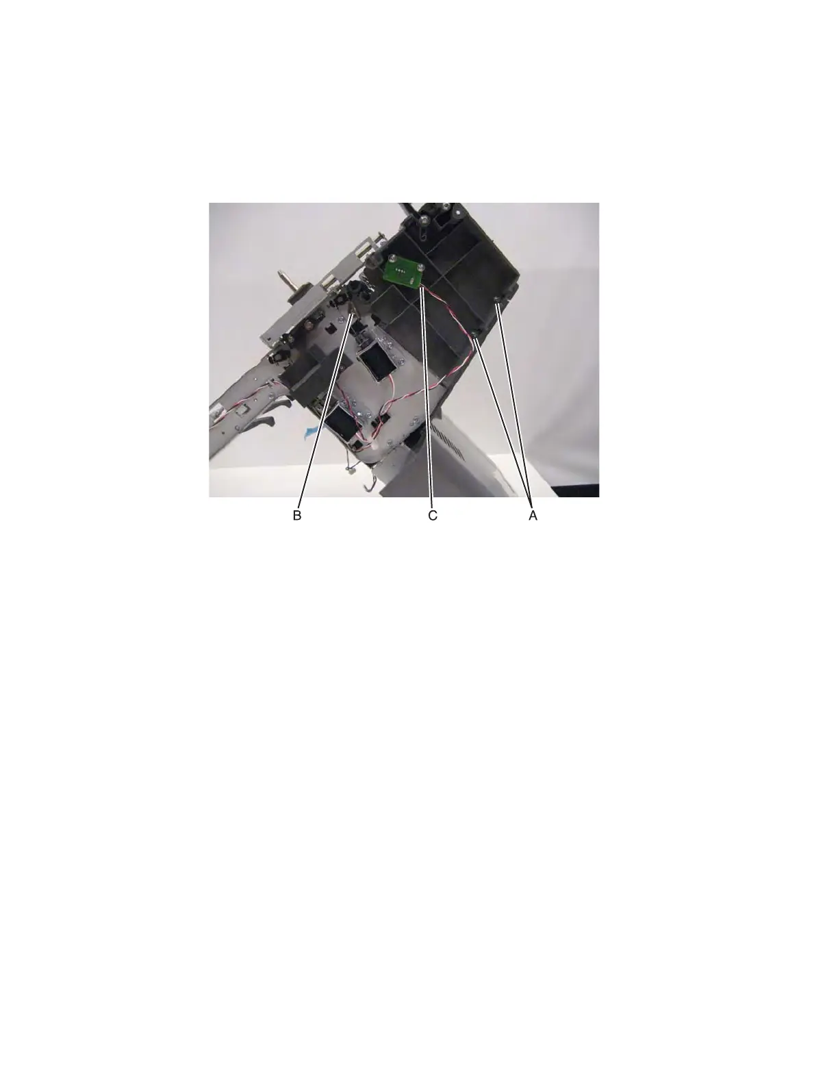 4. Remove the two screws (A), one screw (B) and disconnect the cable (C).