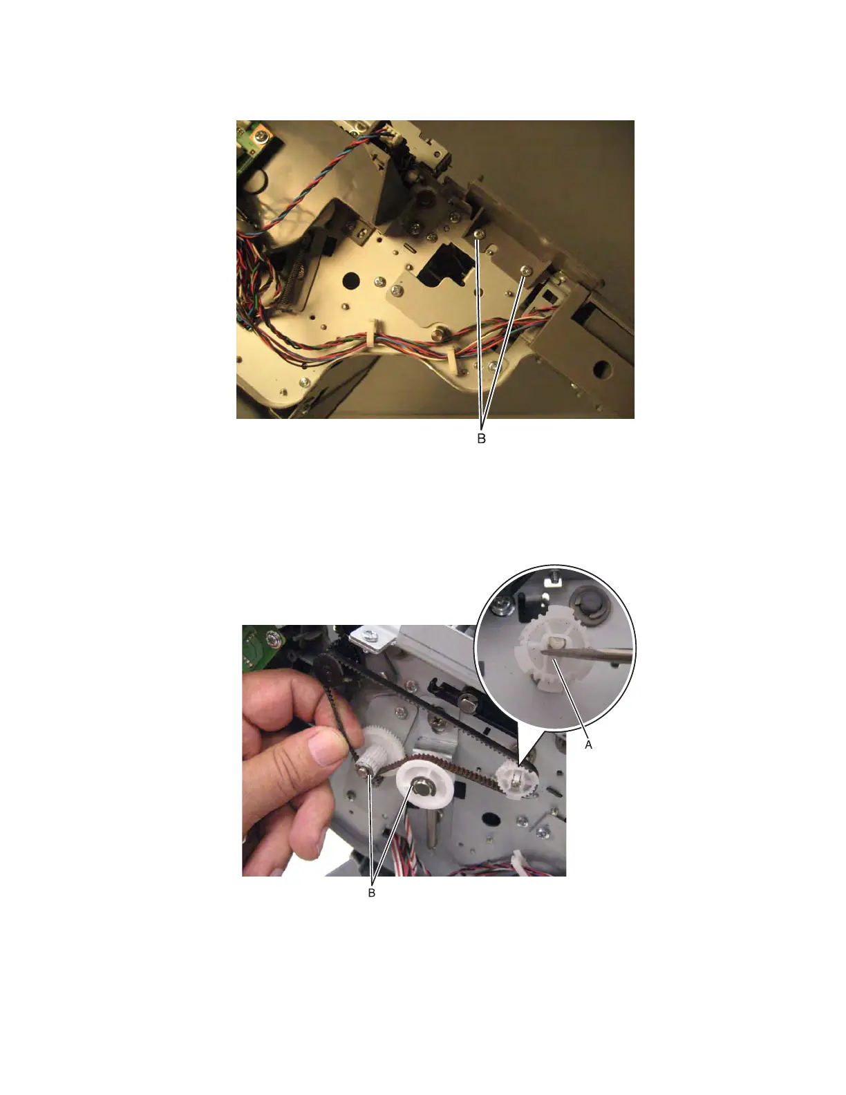 4. Remove two screws (B) from the rear, and then remove the top cover.
