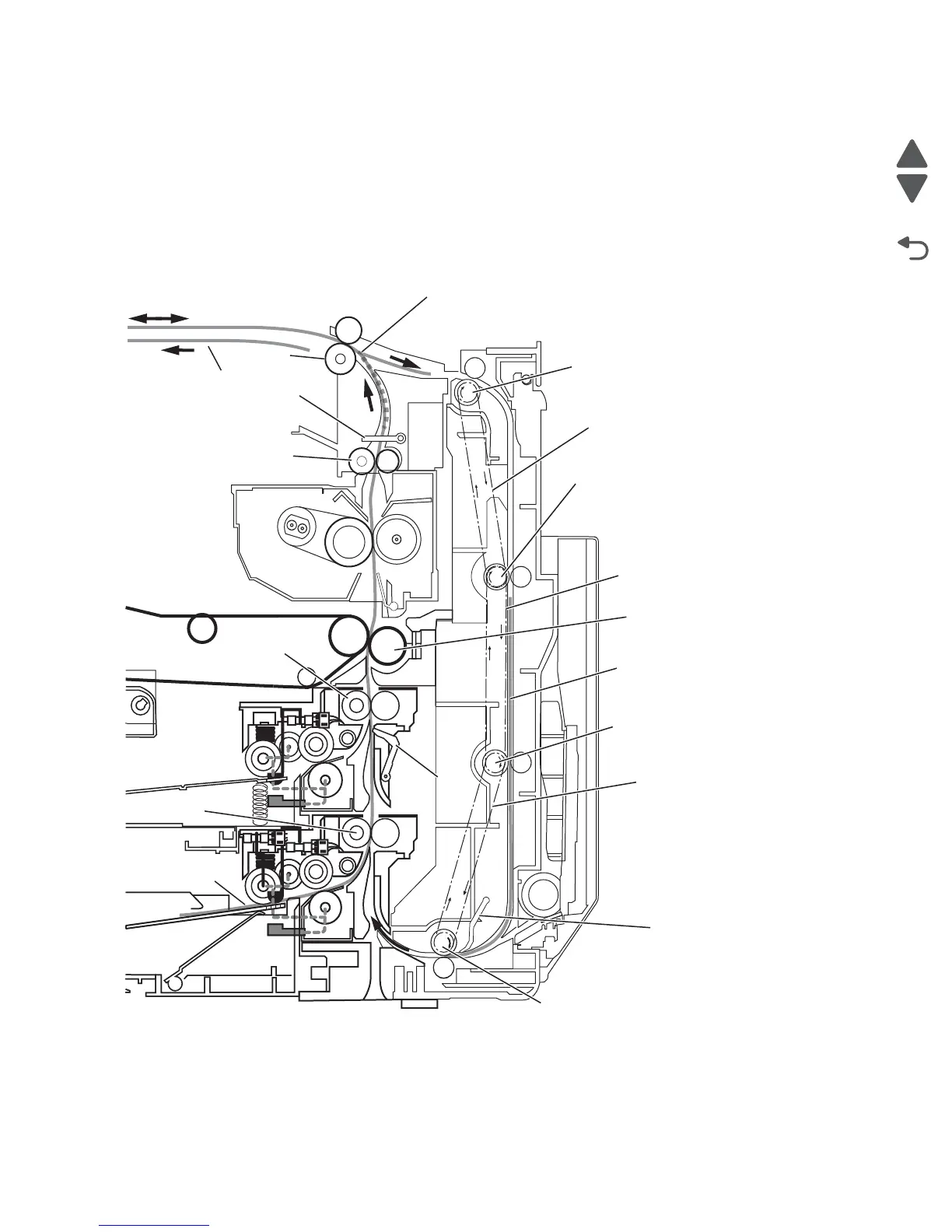 The Duplex Entry Rollers pass the paper down to the Duplex Transport Rollers along the right side of the printer.