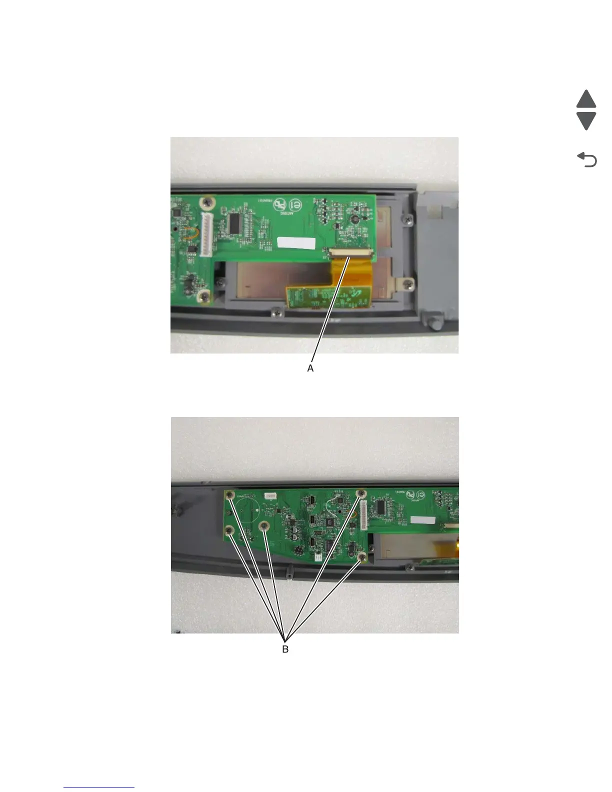 4. Remove the five screws (B) that secure the UICC card to the operator panel assembly.