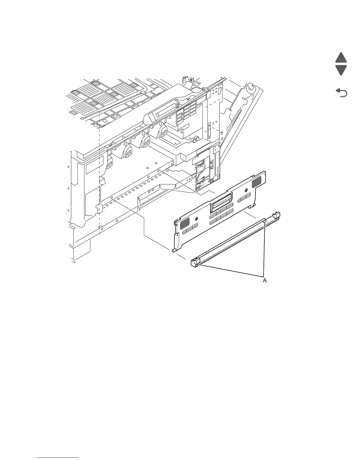 2. Remove the two screws (A) that secure the front metal cover to the printer frame.