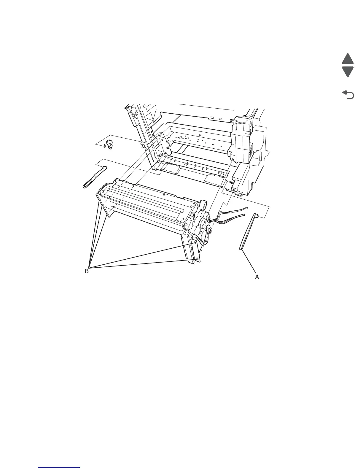 8. Remove the five screws (B) securing the paper feed unit to the printer frame.