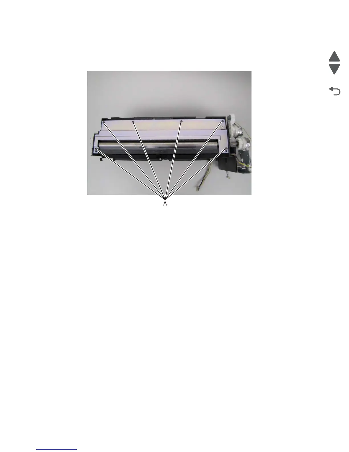 2. Remove the six screws (A) that secure the discharge brush plate to the paperfeed unit.