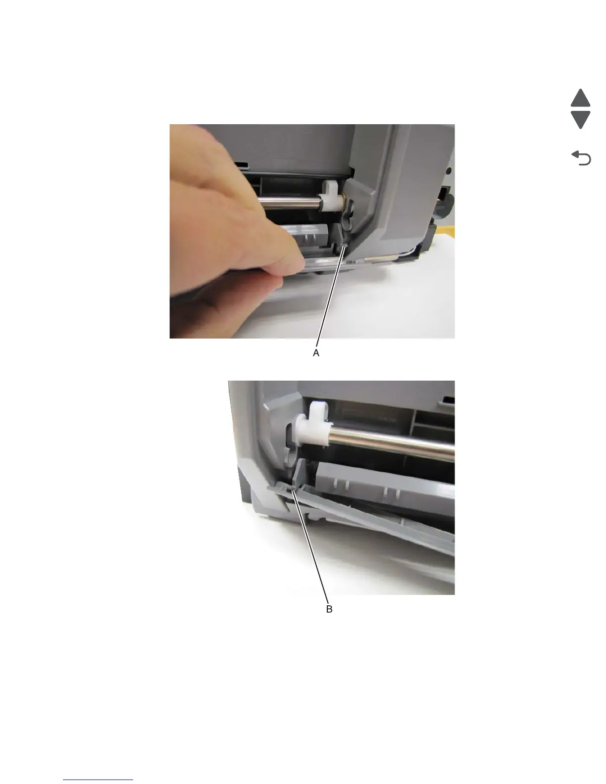 2. Gently pull the right side of the pad holder cover and disconnect it from the mount (A).