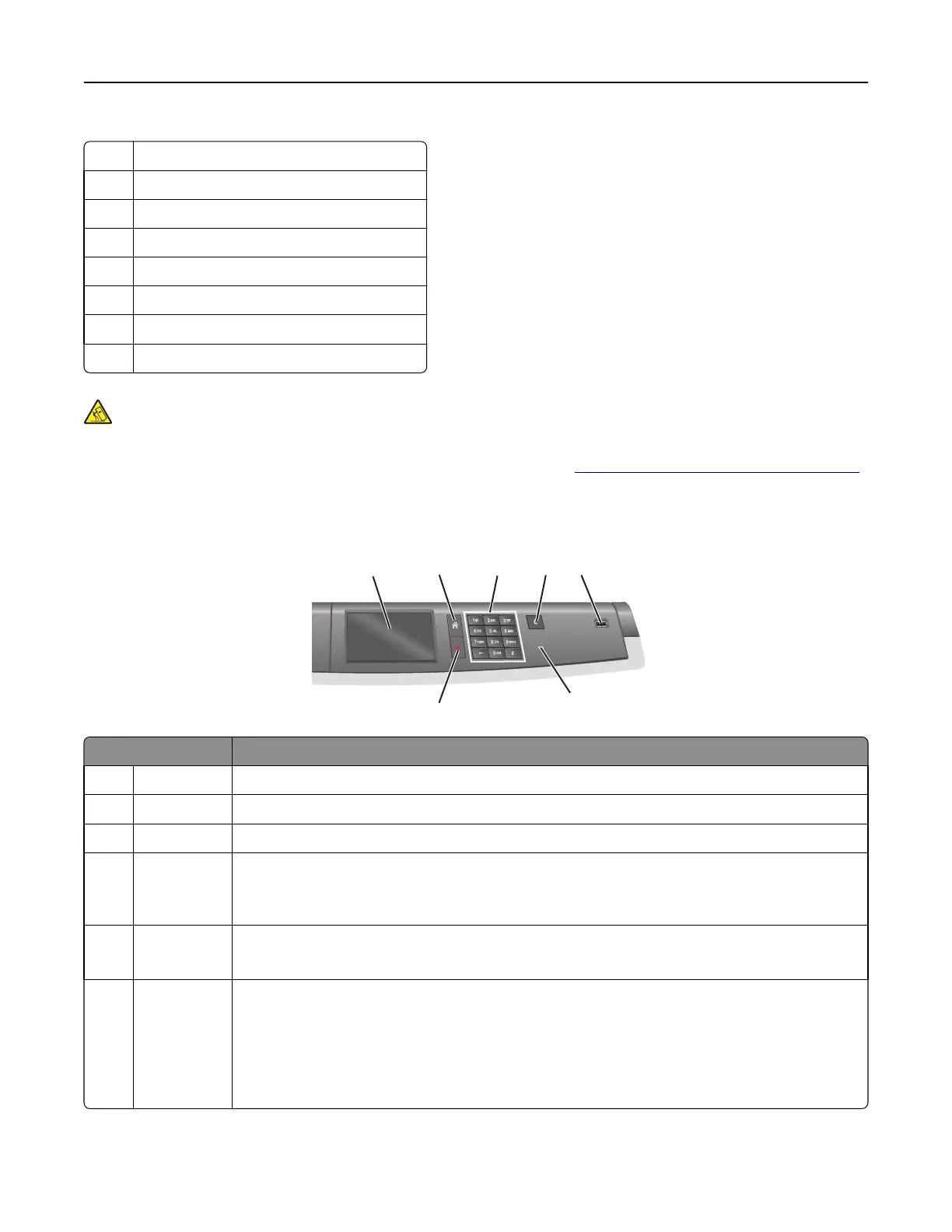 5 USB port Allows the user to connect a USB flash drive to the printer