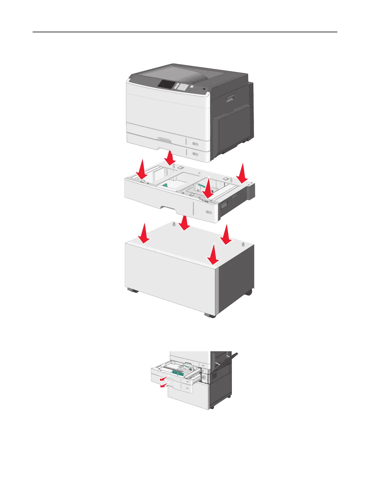 4 Align the optional tray to the printer stand, then lower the printer to the tray.