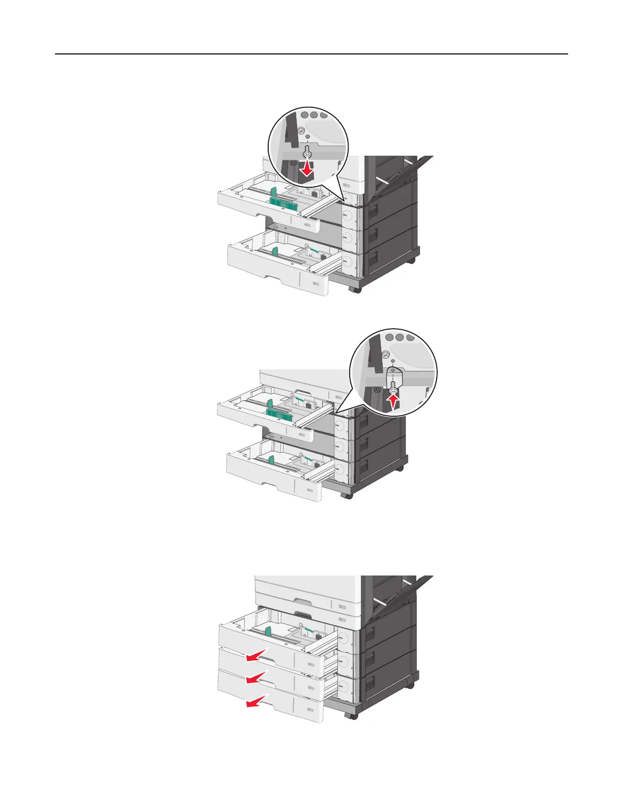 a Remove the upper optional 550-sheet tray drawer. Leave the lower optional trays open.