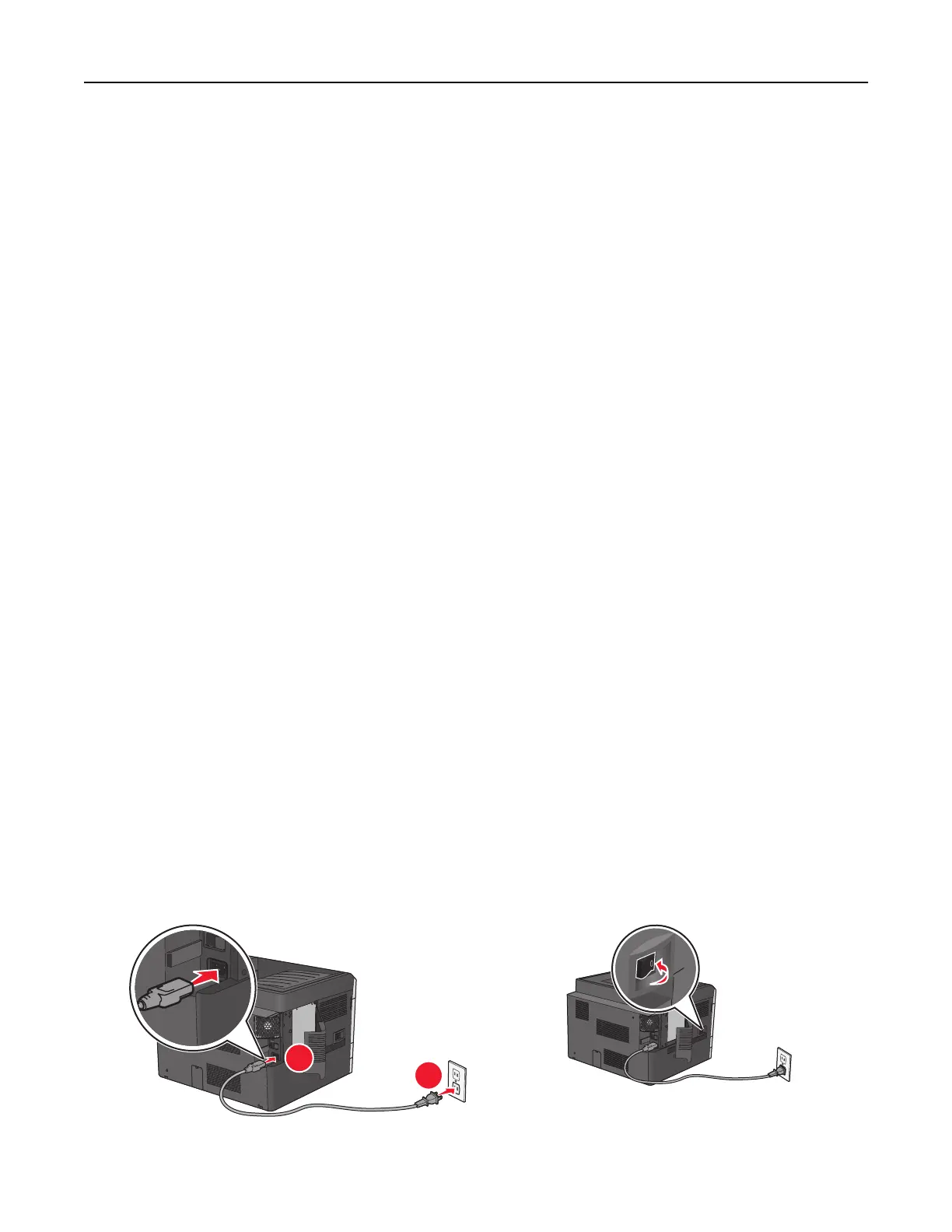 1 Connect the power cord to the printer, then to a properly grounded electrical outlet, and then turn on the printer.