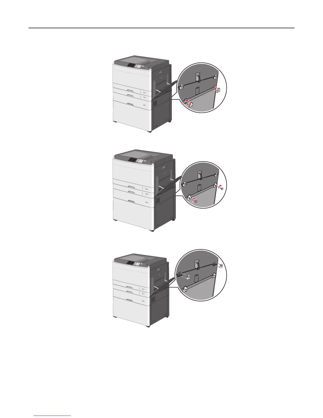c Insert brackets on the slots located at the back of the printer and optional tray.
