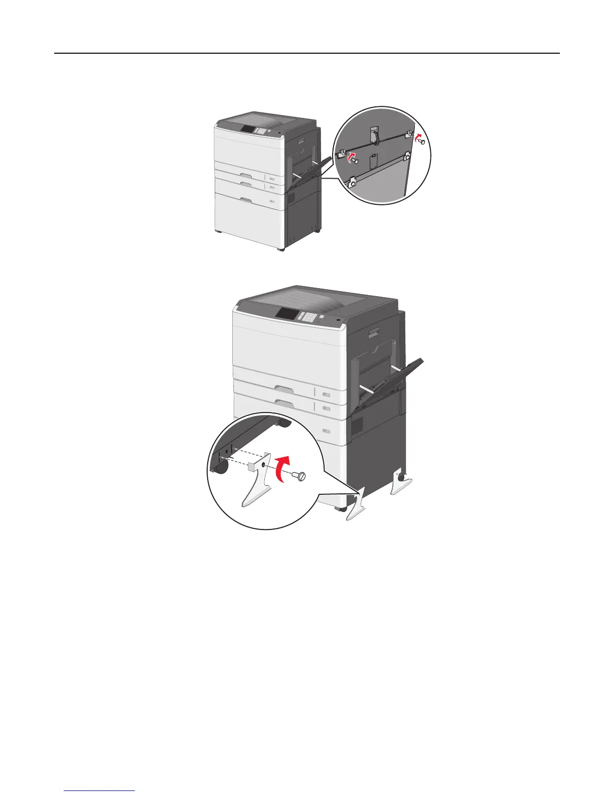 9 Insert the bases on the slots at the sides of the printer stand and secure them with screws.