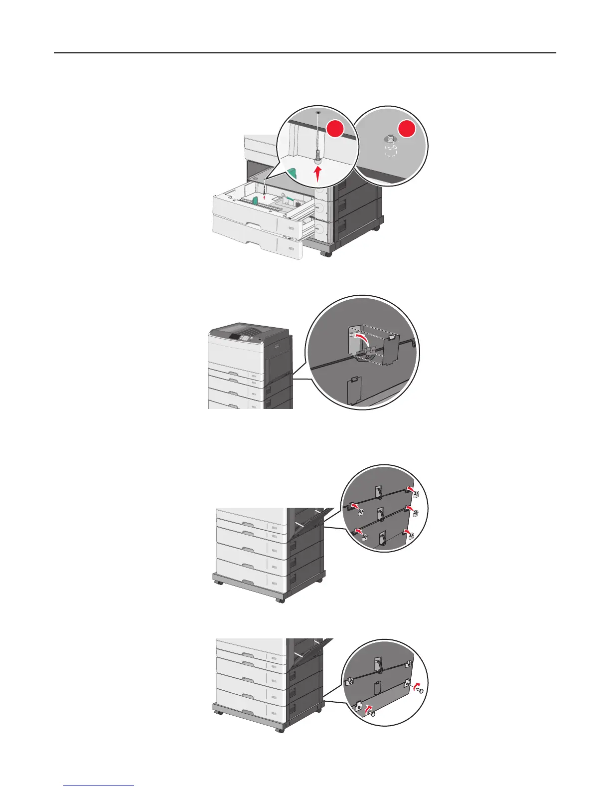 9 Attach brackets to the back of the printer and optional trays.