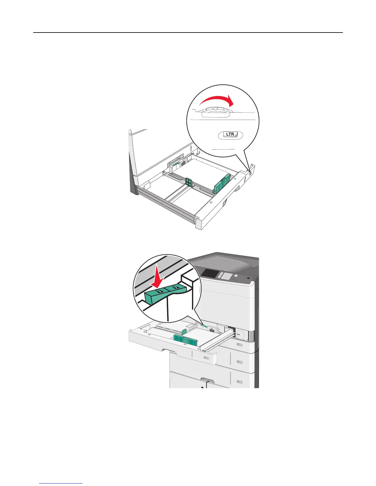 6 Adjust both the width and length guides to lightly touch the edge of the paper stack. Make sure the paper fits loosely