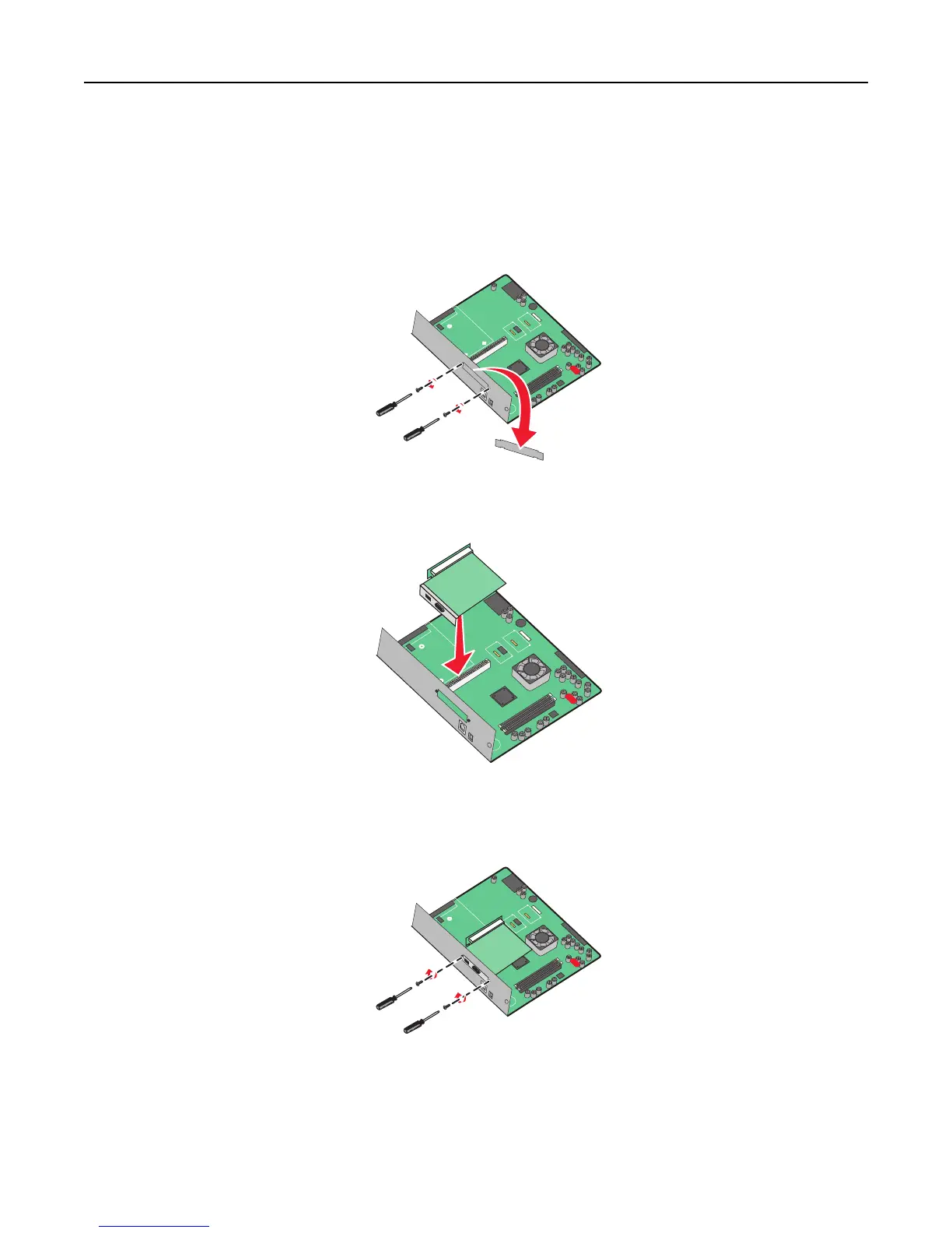 4 Align the connector on the internal print server or port interface card with the connector on the system board.