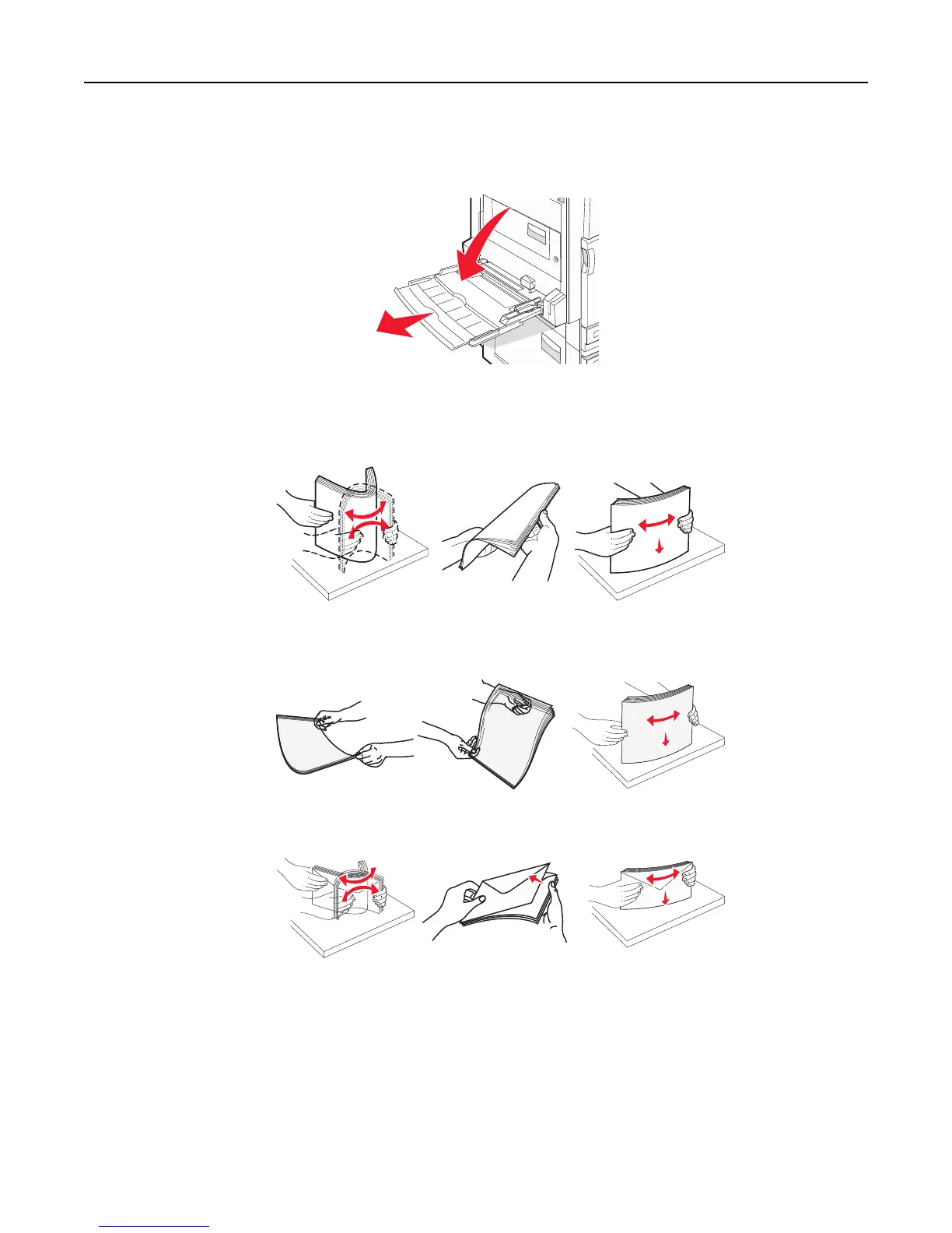 • Flex sheets of paper back and forth to loosen them, and then fan them. Do not fold or crease the paper. Straighten