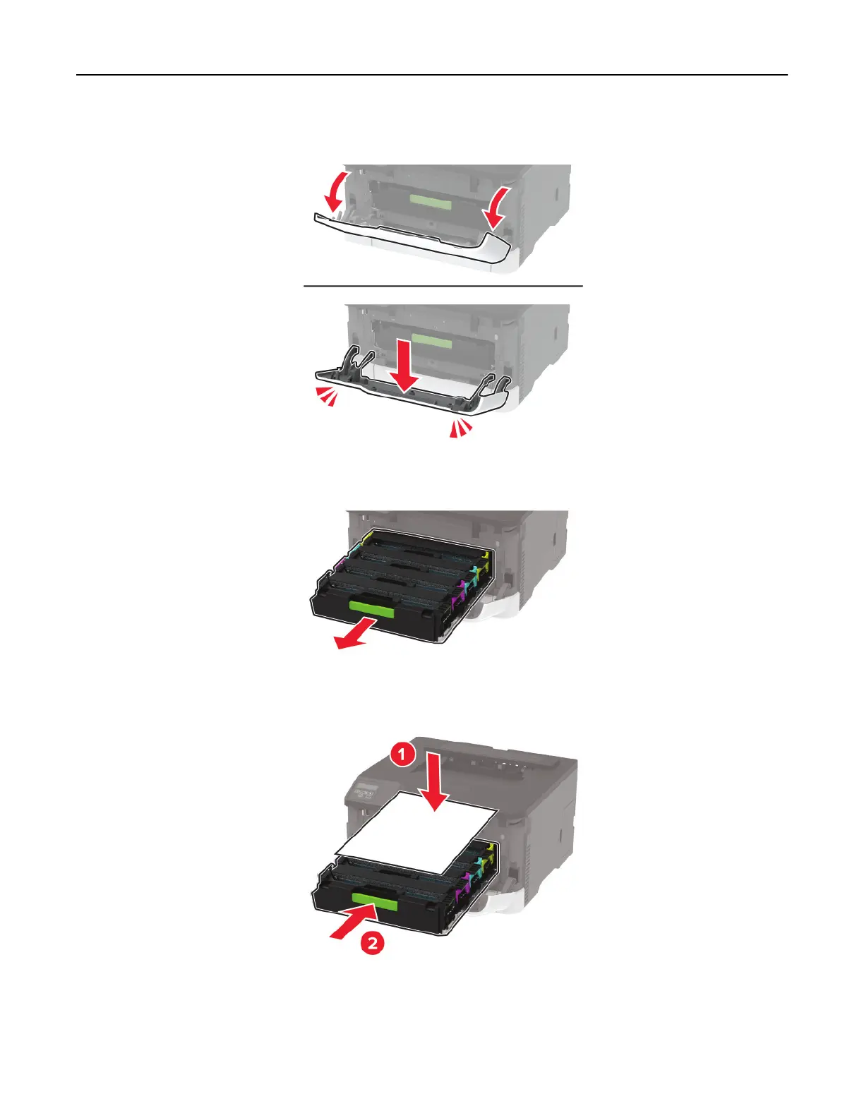 5 To avoid stray toner contamination, place a sheet of paper on the top of the print cartridge tray, and then