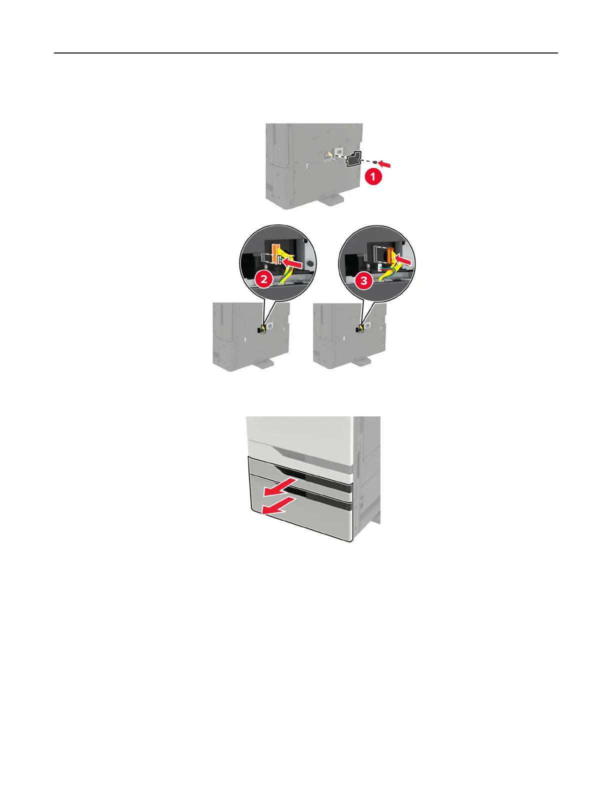 4 Using the screwdriver stored inside door A, disconnect the 2 x 500 or 2500sheet tray cable from the rear