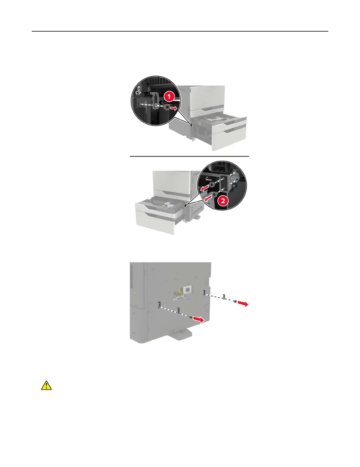 6 Remove the metal brackets and the locking clip that secure the 2 x 500‑ or 2500‑sheet tray to the printer.