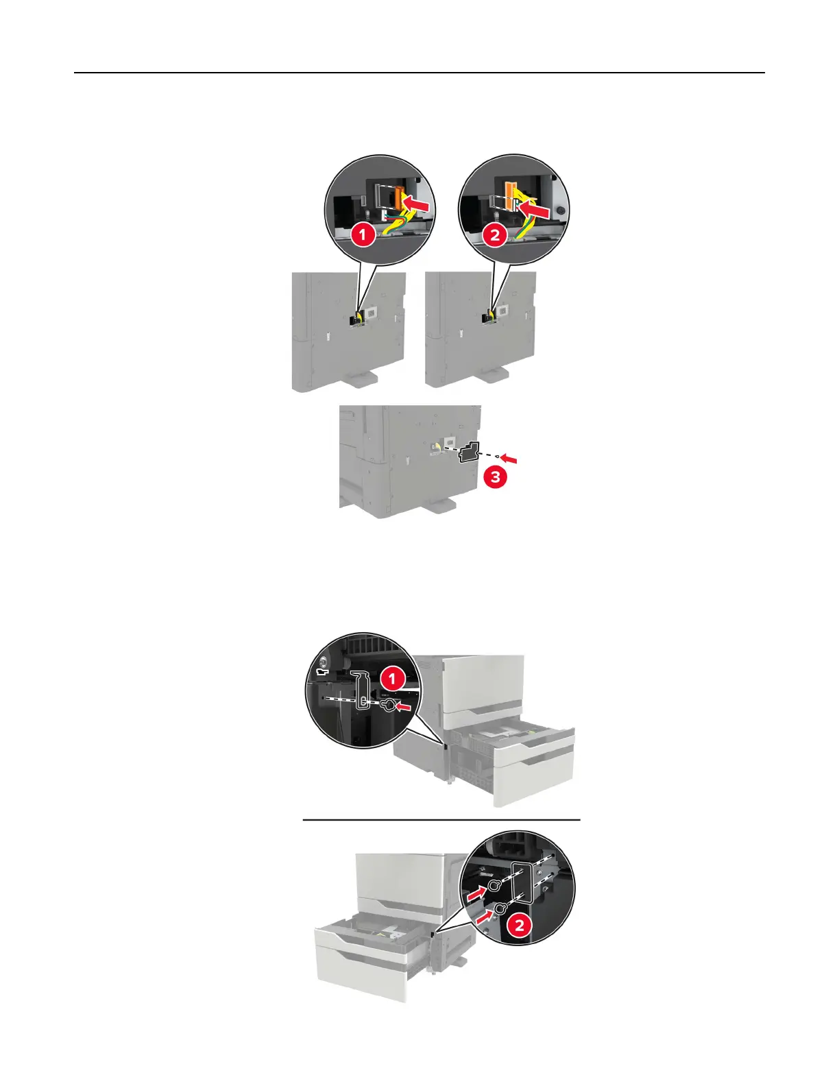 23 Open trays 2 and 3, and then secure the 2 x 500 or 2500sheet tray to the printer with the locking clips