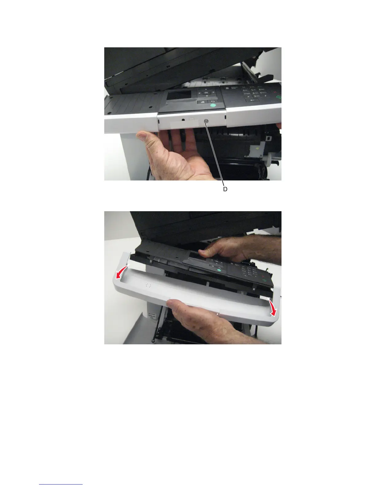 7 Remove the operator panel cover from the front of the printer.
