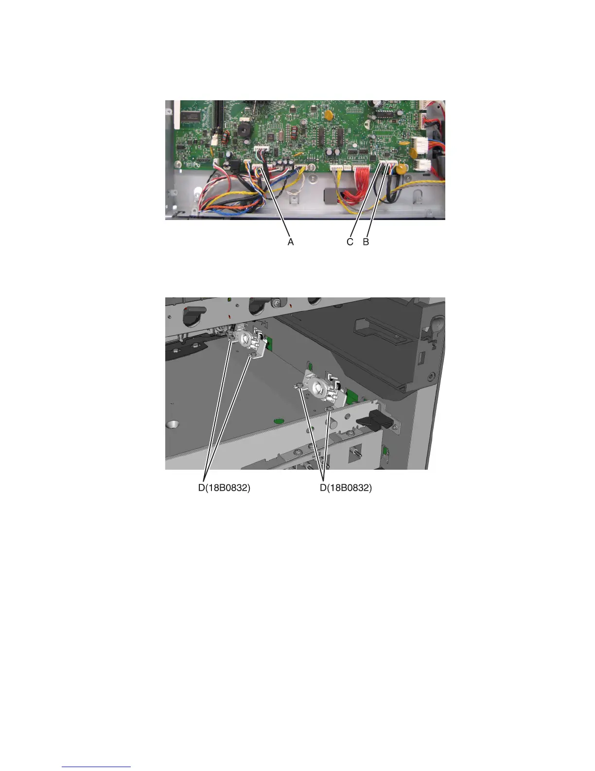 3 Disconnect the toner density sensor cable from JTDS1 connector (A) or JTDS2 connector (B) on the controller board.