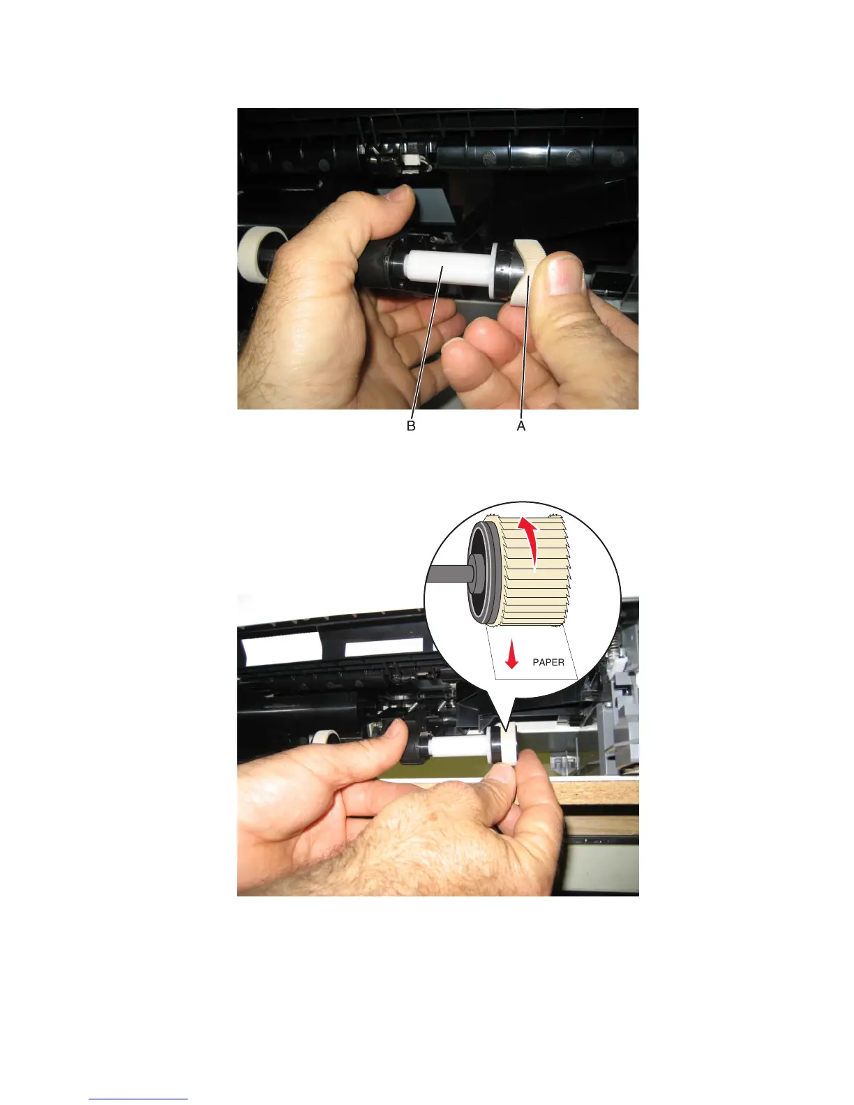 3 Remove the rubber tire (A) from the pick roll assembly (B). Repeat for the other tire.