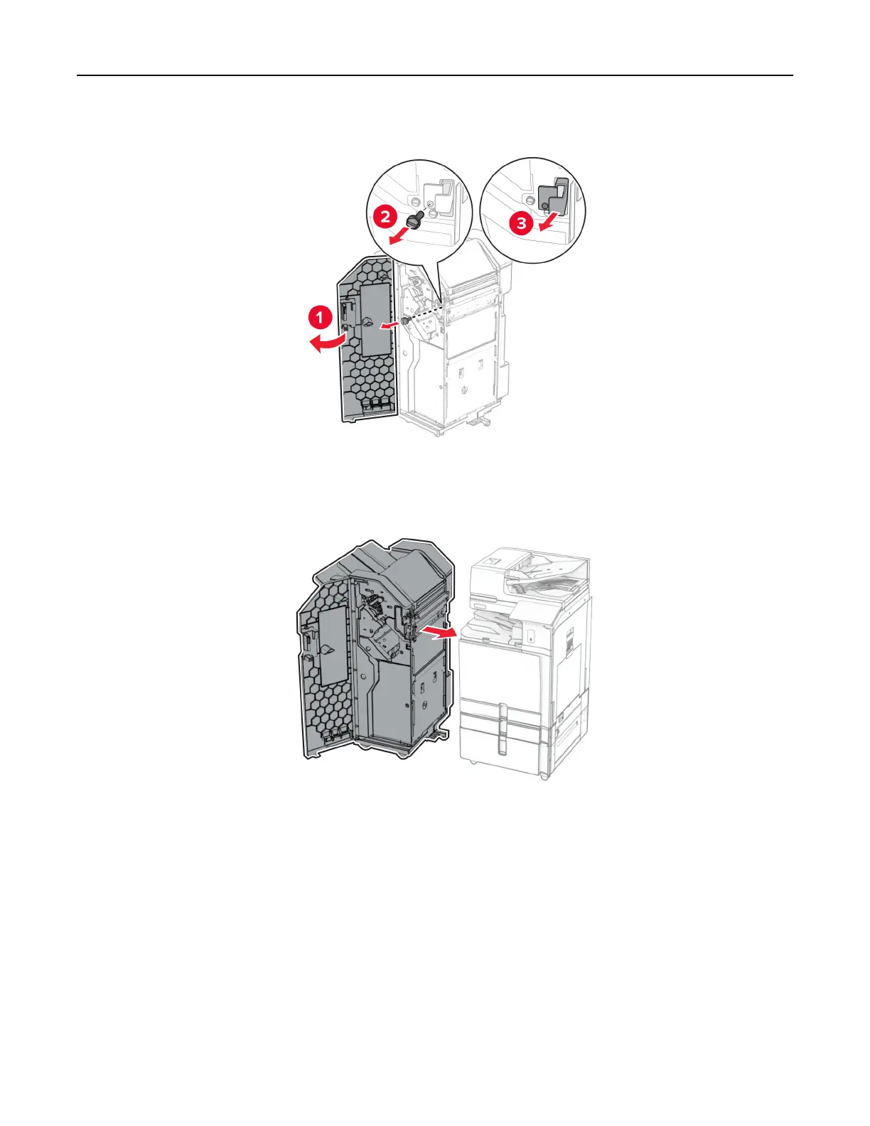 32 Open the finisher door, remove the screw, and then pull the finisher lock.