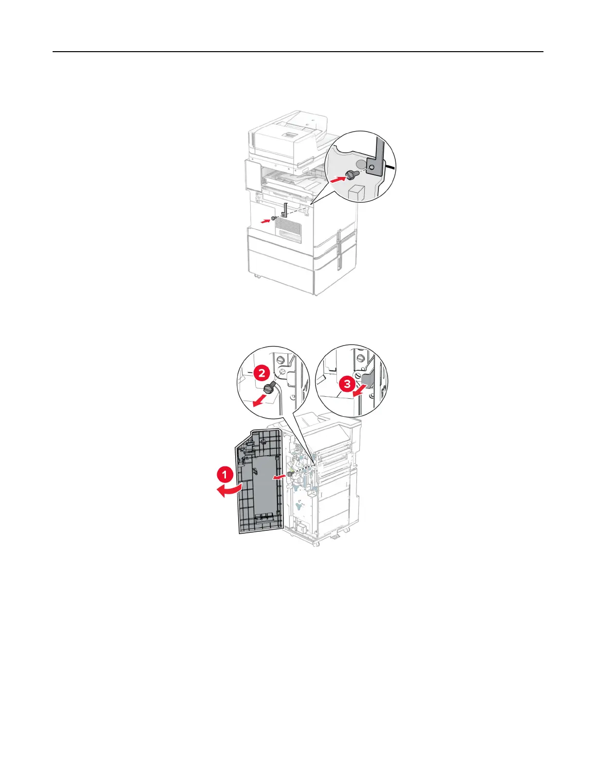 33 Open the finisher door, remove the screw, and then pull the finisher lock.