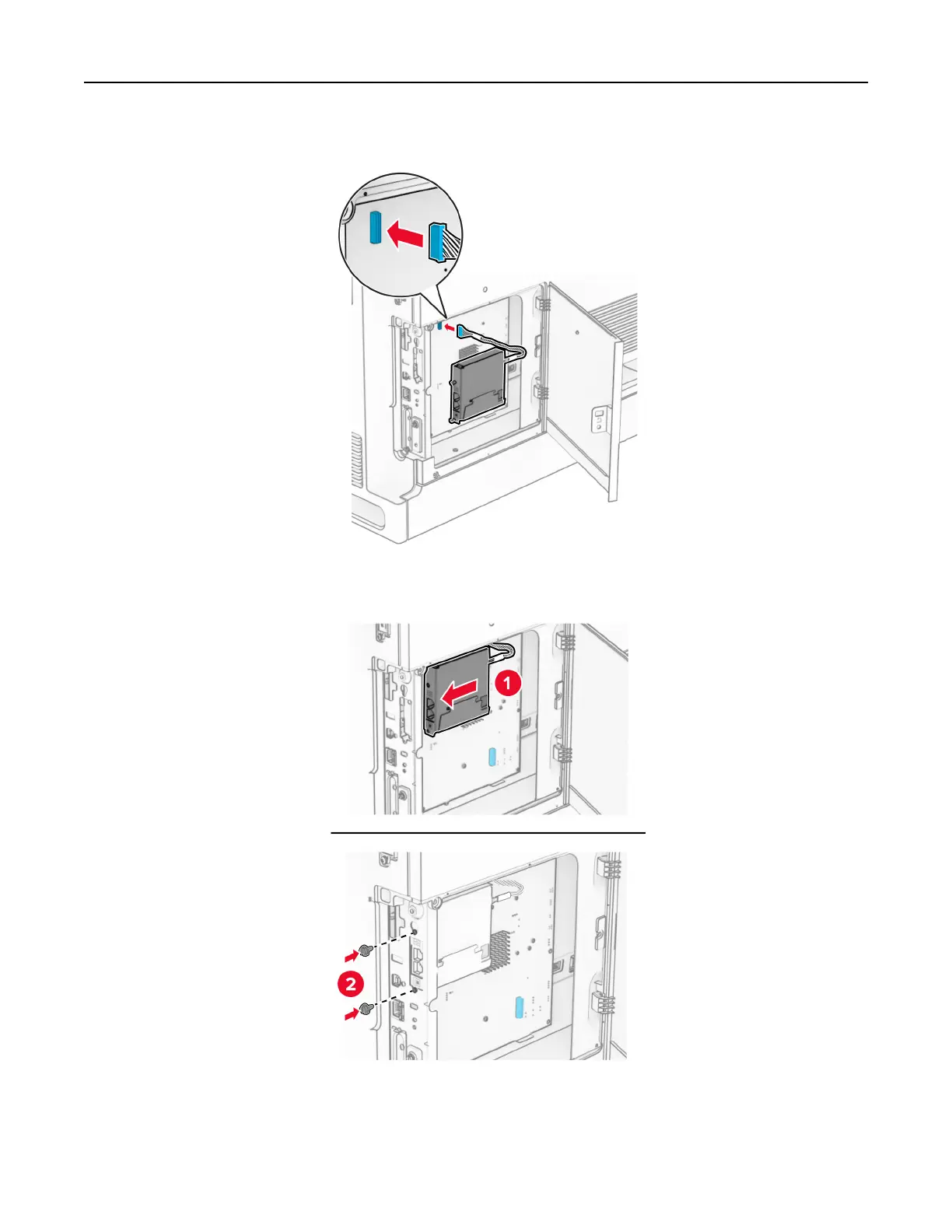 7 Align, and then install the fax card to the printer.
