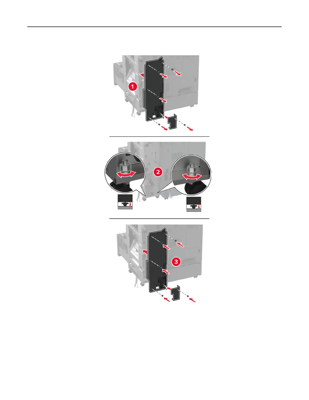 13 Adjust the leveling screws to make sure that the rear of the finisher has the same height as the printer.