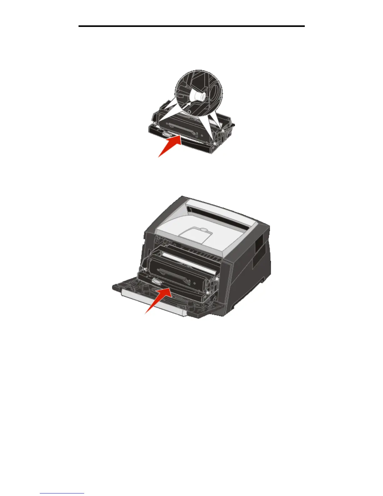 with the white arrows on the tracks of the photoconductor and pushing the toner cartridge in as far as it will go. The
