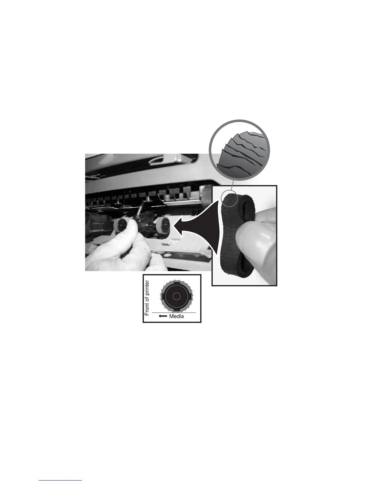 6. Make sure the new paper feed rollers are captured between the rims of the plastic hub.
