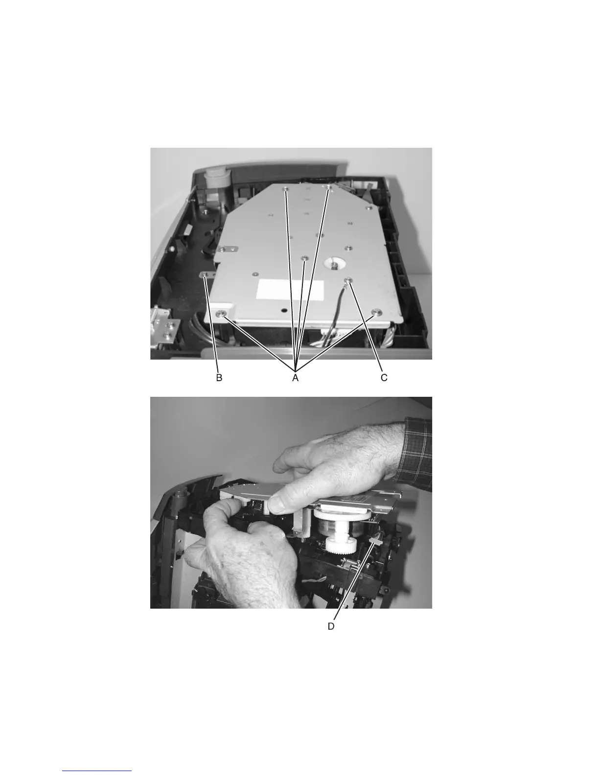 4. Lift the main motor drive, and disconnect the motor cable (D).