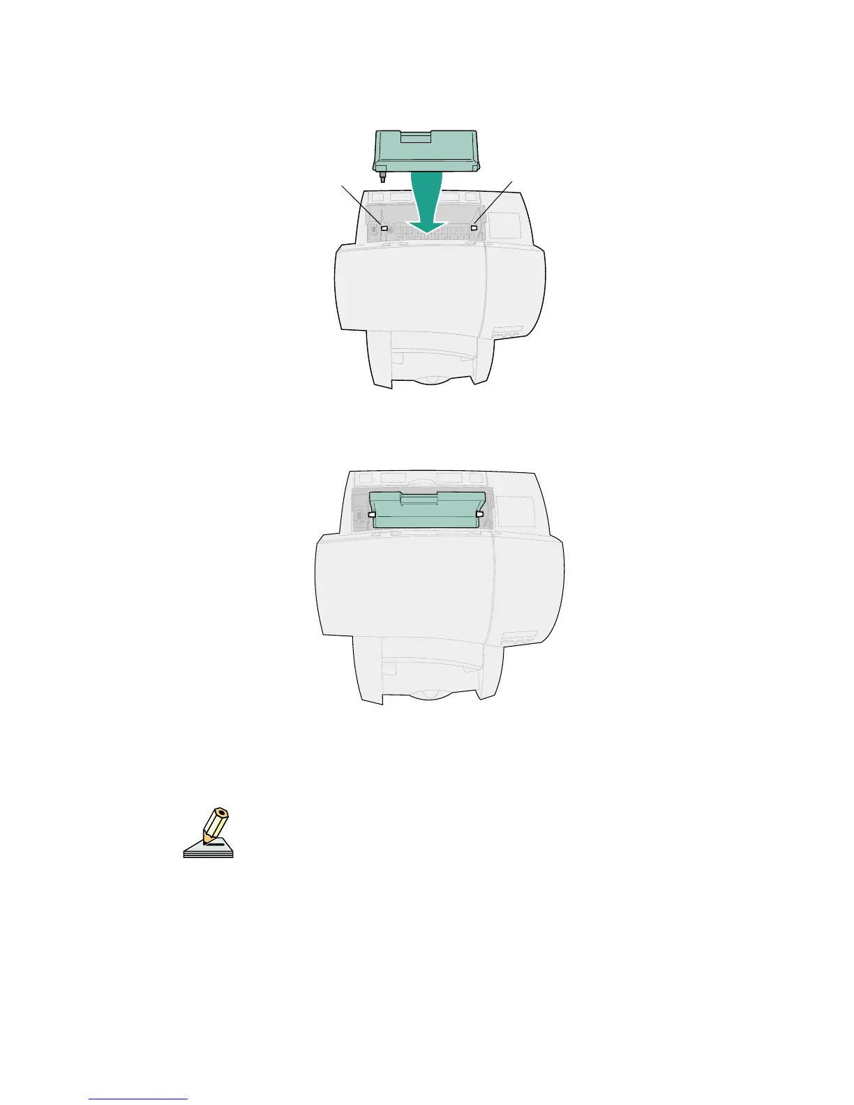 6 Lower the cartridge until the latches snap over the cartridge as shown.