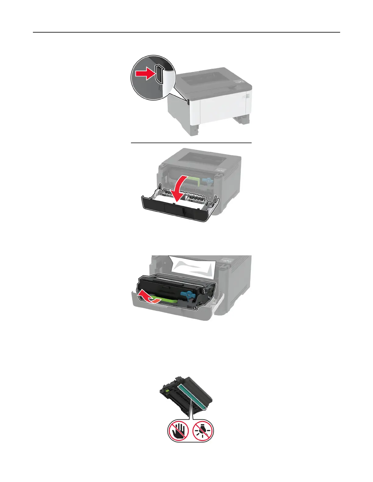 Warning—Potential Damage: Do not touch the photoconductor drum. Doing so may