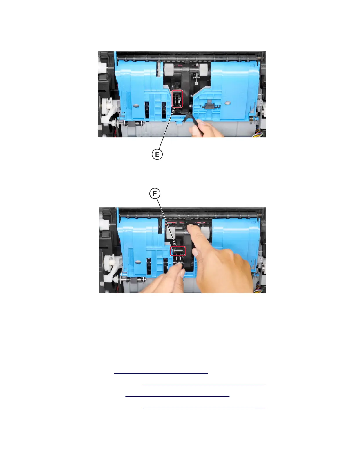 d Place the hook behind the pick roller assembly supporting bracket (F), and then snap it into place.
