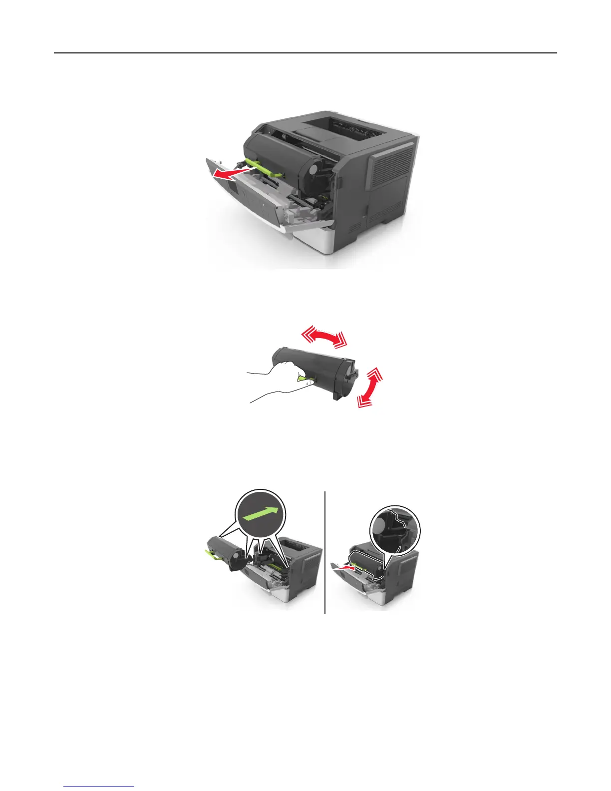 5 Insert the toner cartridge into the printer by aligning the side rails of the cartridge with the arrows on the side rails